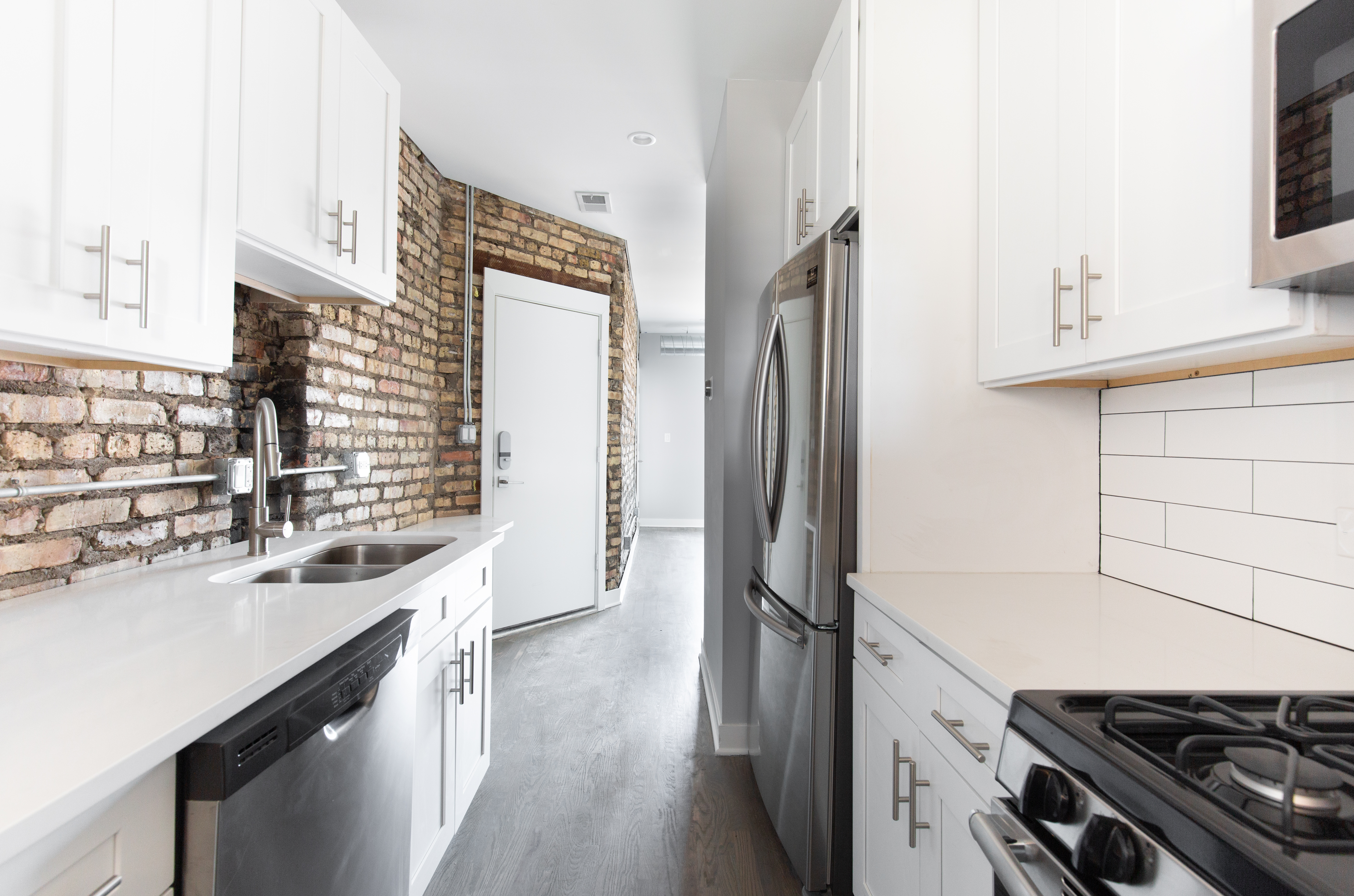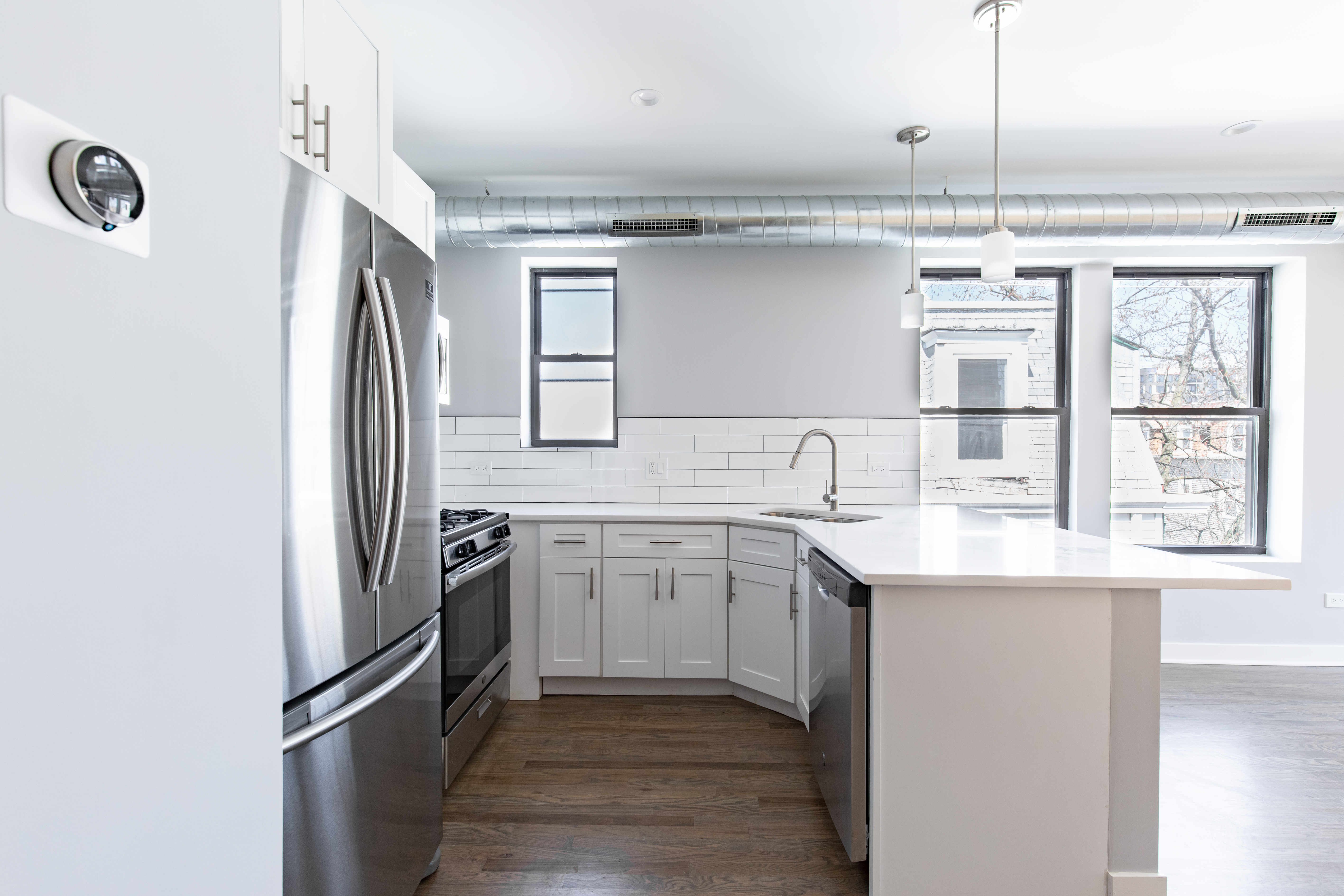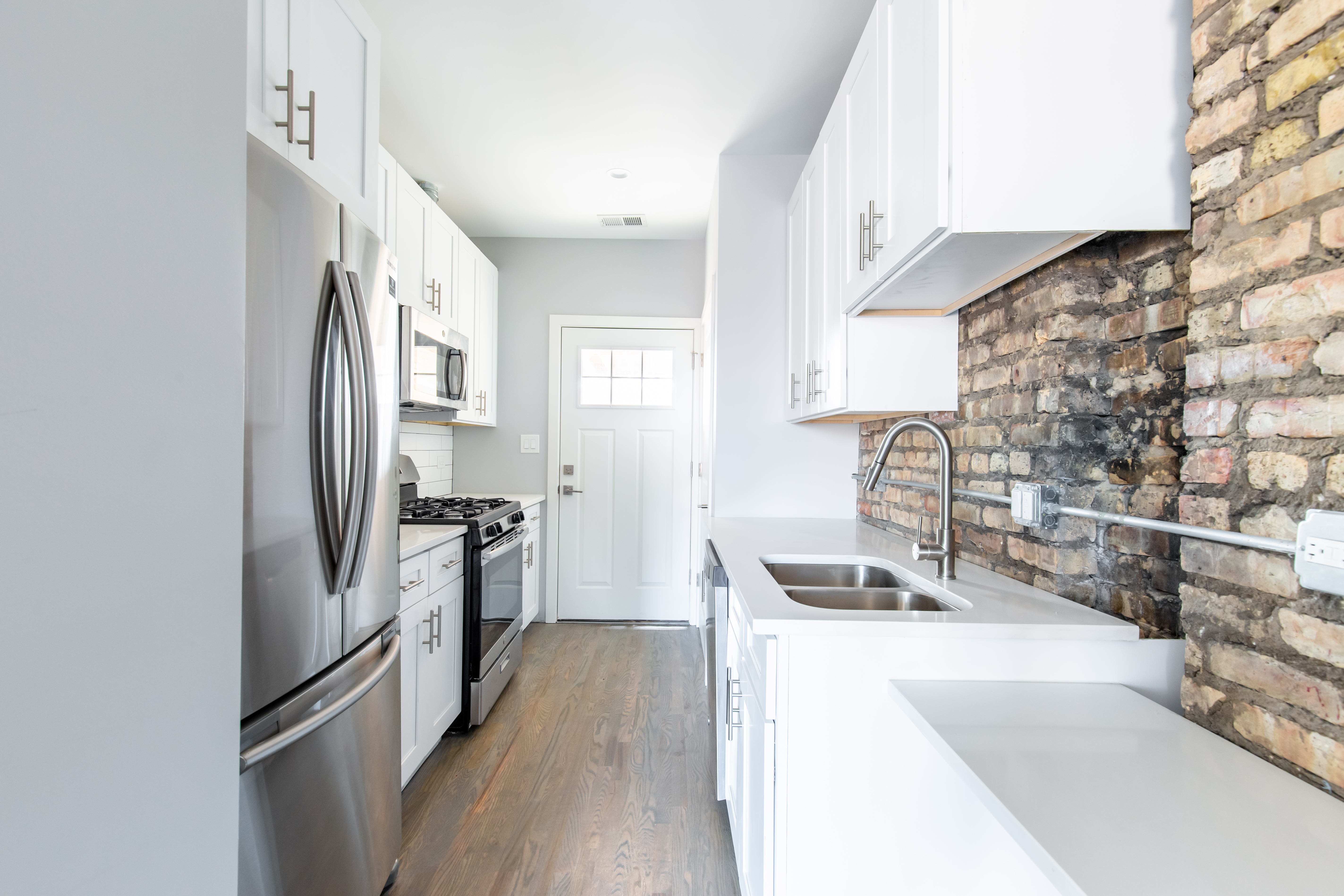 Each apartment was fully renovated with a new kitchen with modern cabinets, SS appliances, quartz countertops, tile backsplash, and a garbage disposal. New bathrooms feature full-tile showers with new tile floors, large vanities, and high-end matte black plumbing fixtures. The apartments would also include in-unit washers/dryers, Nest thermostats, new door entry systems by LATCH, and private outdoor space.